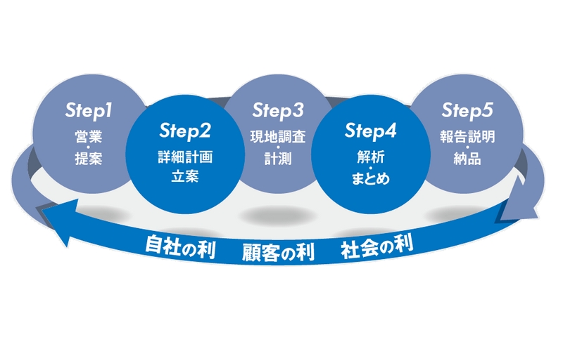 そのため、仕事に対して「自社の利」、「顧客の利」に加えて 「社会の利」を意識することが重要であると考えております。これまで組織として培ってきた 技術力と知識を活かし、さらに成長し続けながら、営業提案から現地調査 さらに報告までのStep1からStep5の一貫した対応を組織全体で取り組んでおります。 それにより、顧客との信頼関係が築けると考えております。