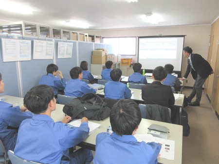 入社式終了後、新入社員全体研修が始まります。新入社員全体研修ではベテランの社員が講師を務め、社内の規則・規定、コンプライアンス、技術者倫理、安全衛生、情報セキュリティなど、さまざまなカリキュラムを実施します。