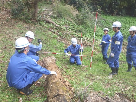 令和6年度からは、ミクニヤの杜(弊社は令和6年1月15日、川崎市と里山保全管理活動に関する覚書を締結し「ミクニヤの杜」を始動しました。詳細はこちらから。 )を活用した「現場研修」も1つのカリキュラムとして取り入れました。現場研修では、先輩社員から、安全管理を念頭に現場準備から現地計測、計測結果取りまとめまでの一連の流れを学びます。